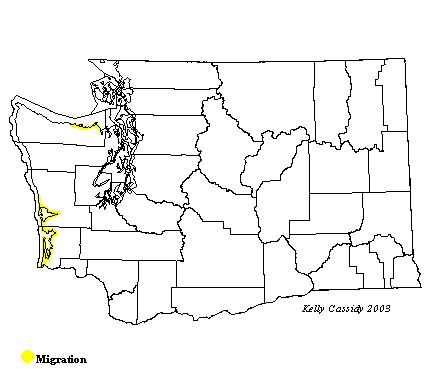 A very few American Golden-Plovers may be found on the outer coast in the spring, as they move through Washington in April and May. The longer fall migration period lasts from August through October, and flocks of 50-150 are regularly seen in places such as Grays Harbor and Leadbetter Point. They are regularly but rarely recorded around Puget Sound and in eastern Washington. Adults make up the majority of birds seen in August, while most of the birds in September and October are juveniles. A few individuals may occasionally winter in Washington.