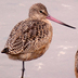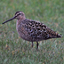 Wilson's Snipe is a rather chunky shorebird, with a short neck and short legs. Its straight bill is very long. It is colored cryptically in mottled brown and black, with prominent light buffy longitudinal stripes on both its head and back. Its flanks are heavily barred, and its tail, barely visible when the bird is on the ground, is a rusty orange. Males, females, and juveniles have virtually the same appearance, and there is no seasonal variation in plumage.